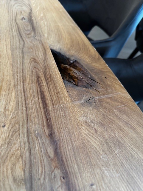 Een zwarte dubbele metalen tafelpoot is voorzien van een massief eikenhouten tafelblad met zichtbare knoesten en kieren.