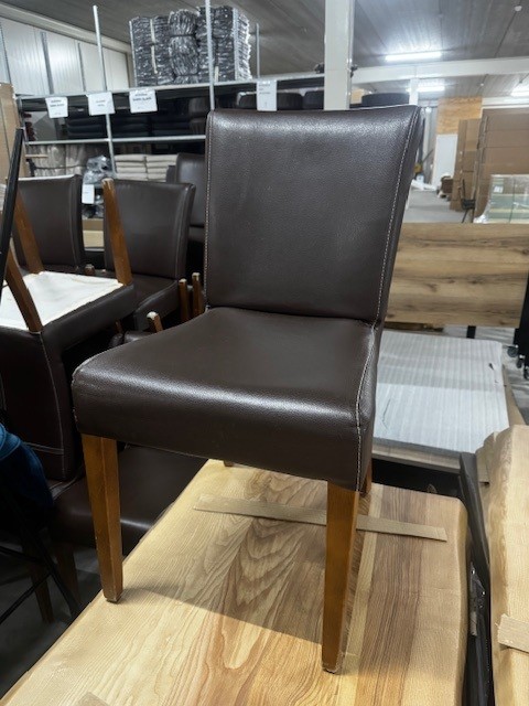 Beukenhouten frame met donkerbruin kunstleder gestoffeerd.