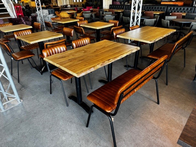 Om de tafels 2 bankjes en 18 stoelen met een zwart metalen onderstel en gestoffeerd met echt leder in cognac kleur.